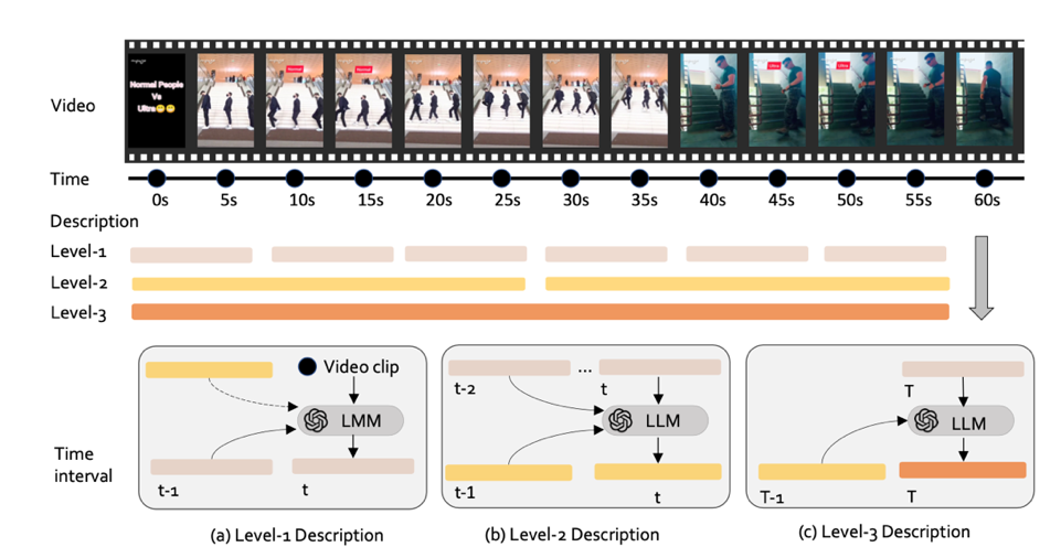 (a) 在第一级,为时间点 t 生成字幕时,参考了当前时间点的帧画面、前一个时间点的字幕,以及(如果适用)最近的第二级总结描述。(b) 在第二级,为时间点 t 生成字幕时,基于前一个第二区间的字幕和最近三个第一区间的字幕。(c) 在第三级,为最终时间点 T 生成整体字幕时,参考了最近的第二区间字幕和当前的第一区间字幕,生成对整个视频内容的全局语义表示。