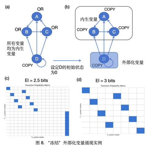 3.变量外部化:这种方法不涉及状态的合并,而是试图将系统中的部分变量移出考虑的范畴,从而减少变量的数量,形成一个新的待考察的内部系统。Erik Hoel在2017年的文章中称此类变量为外生变量(exogenous element),并提出了两种具体处理外部化变量的方式:一种方式称为将外生变量“冻结”,即将其设定为特定的状态,该变量在后续变化中将一直保持该初始状态,不影响系统中其他变量;另一种是将外生变量设为“黑箱”(black boxing),允许其随机变化,但是具体变化情况和对系统的影响都无法查看(不在最后模型的考虑范围内)。变量外部化方式是通过减少系统的状态变量的方式,达到了和一般的将变量归并分组的粗粒化方式一样的效果,即让系统总的状态空间减小,且可能导致EI增大。