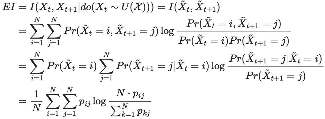 分别为把t时刻的Xt干预为均匀分布后,前后两个时刻的状态,而EI度量的就是在干预操作后,系统前后两个时刻状态之间的互信息。pij为第i个状态转移到第j个状态的转移概率。从这个式子,不难看出,EI仅仅是离散马尔科夫链概率转移矩阵P的函数。进一步,如果马尔科夫链TPM按照行向量形式处理,EI可以写成更加简便的形式