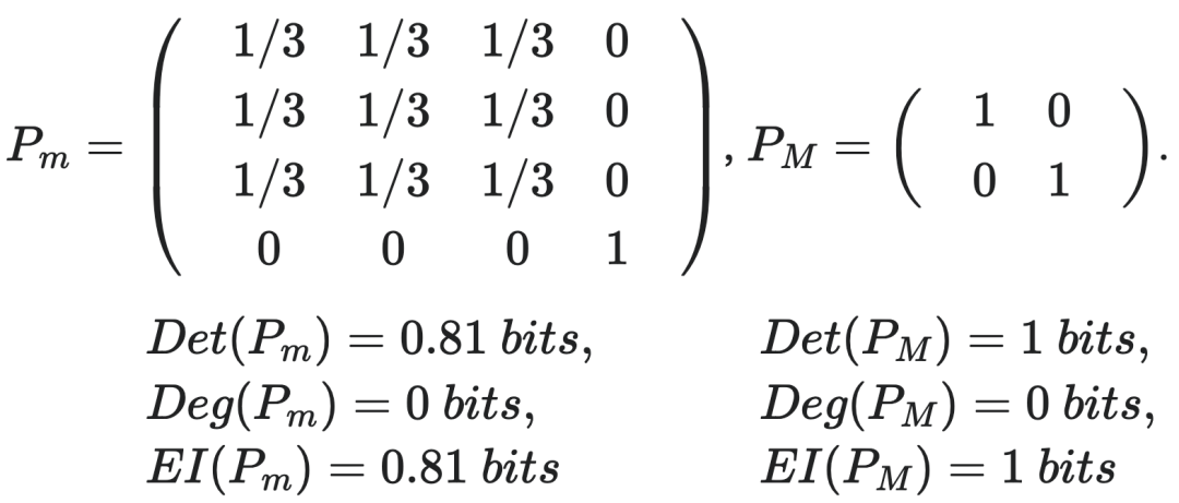 在这个例子中,微观态的转移概率矩阵Pm是一个4*4的矩阵,其中前三个状态彼此以1/3的概率相互转移,这导致该转移矩阵具有较小的确定性,因此EI也较小,为0.81。