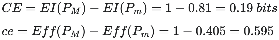 在这个例子中,我们可以计算它的因果涌现度量为: