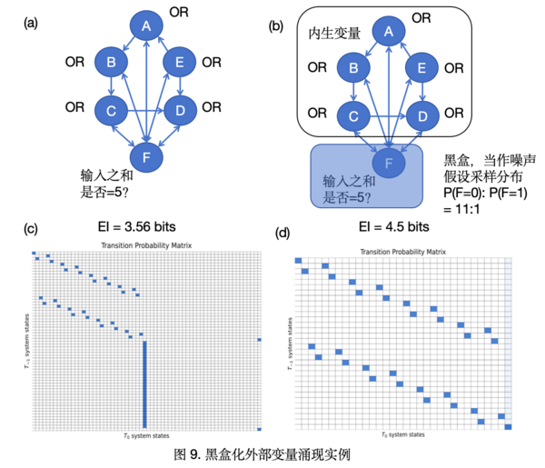 由于粗粒化的过程带来状态空间减小,所以ΔISize总是为负;若要CE>0,即因果涌现发生,那么ΔIEff必须为正值,且粗粒化带来的有效性提升幅度要超过状态空间缩减所导致的EI减小的幅度。