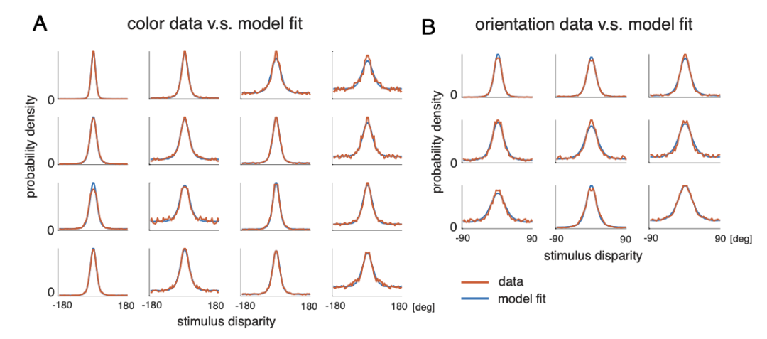 图 3. 该模型仅依赖两个自由参数,便能够很好地拟合视觉短时记忆(VSTM)实验中的颜色和方向数据。