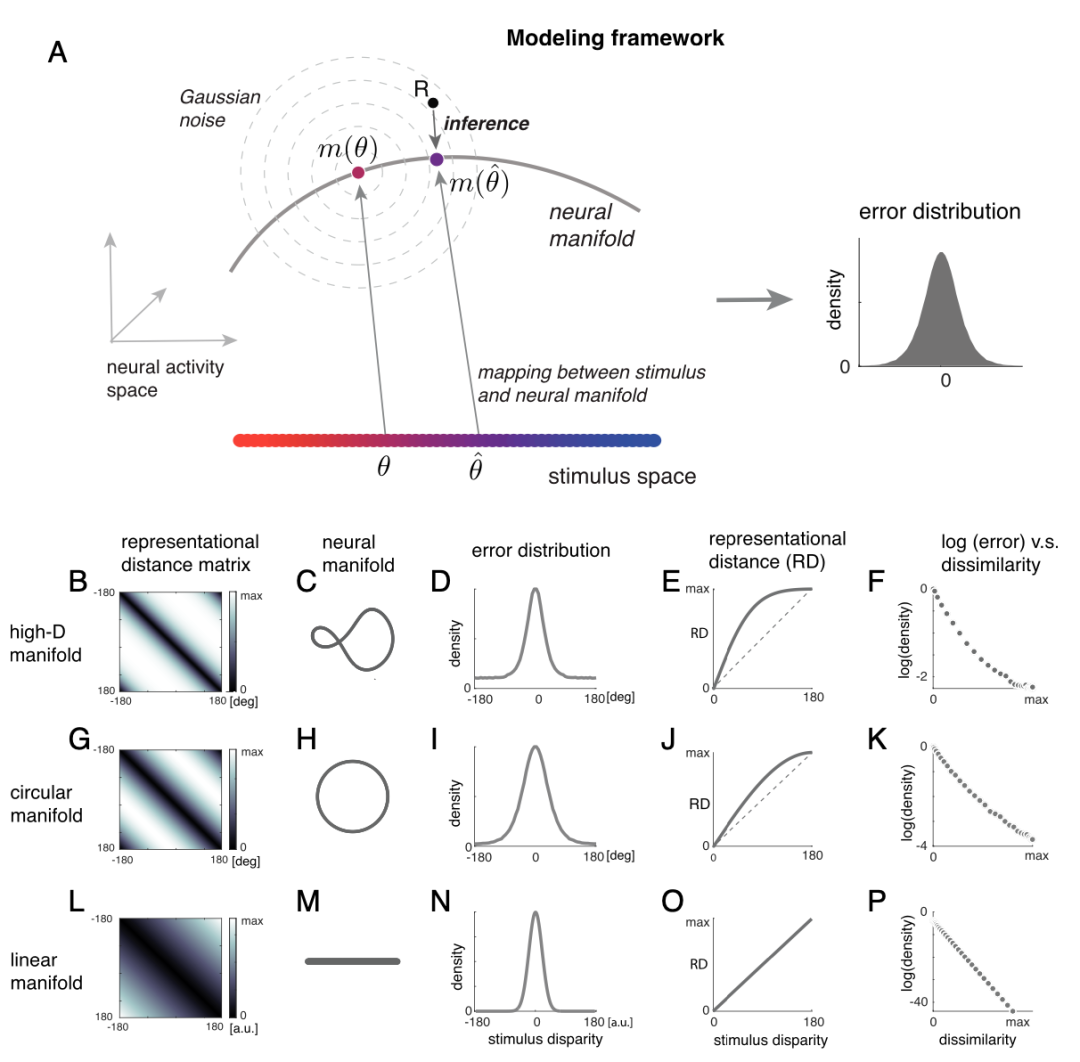 在认知科学和神经科学领域,研究行为任务中的误差分布对于理解大脑计算机制至关重要。传统观点认为,在估计连续变量(如颜色、方向、位置)时,误差分布应近似服从高斯分布。这一假设主导了对工作记忆限制的研究,并用于解释误差偏离正态性的现象。然而,许多实验研究发现,行为任务中的误差分布往往具有非高斯特征,呈现出平坦尾部(flat tails),这一发现挑战了经典的噪声假设。近日发表于 PNAS 的一项研究提出,误差分布的形状实际上由神经表征的几何结构决定,而非单纯的随机噪声效应。研究者基于贝叶斯观察者模型(Bayesian Observer Model),推导出神经流形(Neural Manifold)的几何特性如何影响行为误差,并使用视觉短时记忆任务的实验数据验证了该理论。这一发现挑战了既有的工作记忆理论,强调神经编码的几何结构是决定认知误差的重要因素。