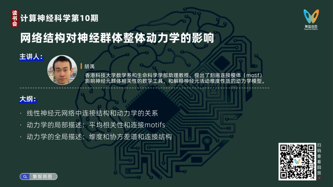 集智俱乐部计算神经科学读书会中,香港科技大学助理教授胡禹老师分享了他们在这方面的相关工作,他们发现协方差谱的解析解具有长尾分布特征,而且该特征在模型改动下非常稳定,并与斑马鱼钙成像数据吻合。这为神经元群活动的几何特征提供了基于网络连接结构的机制,并为解释数据提供了定量基准。感兴趣的可以扫码查看视频回放👇