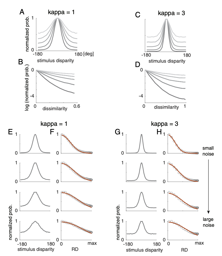 此外,研究者还测试了n-项迫选任务(n-AFC, n-Alternative Forced Choice),并基于2-AFC(两选一任务)数据推导出60-AFC和360-AFC任务的误差分布。实验结果表明,该模型无需额外参数即可准确预测大规模选择任务中的误差分布,这一发现进一步支持了模型的通用性。这些结果表明,误差分布并非由单纯的记忆容量限制或随机猜测机制决定,而是源自于神经表征的几何结构。