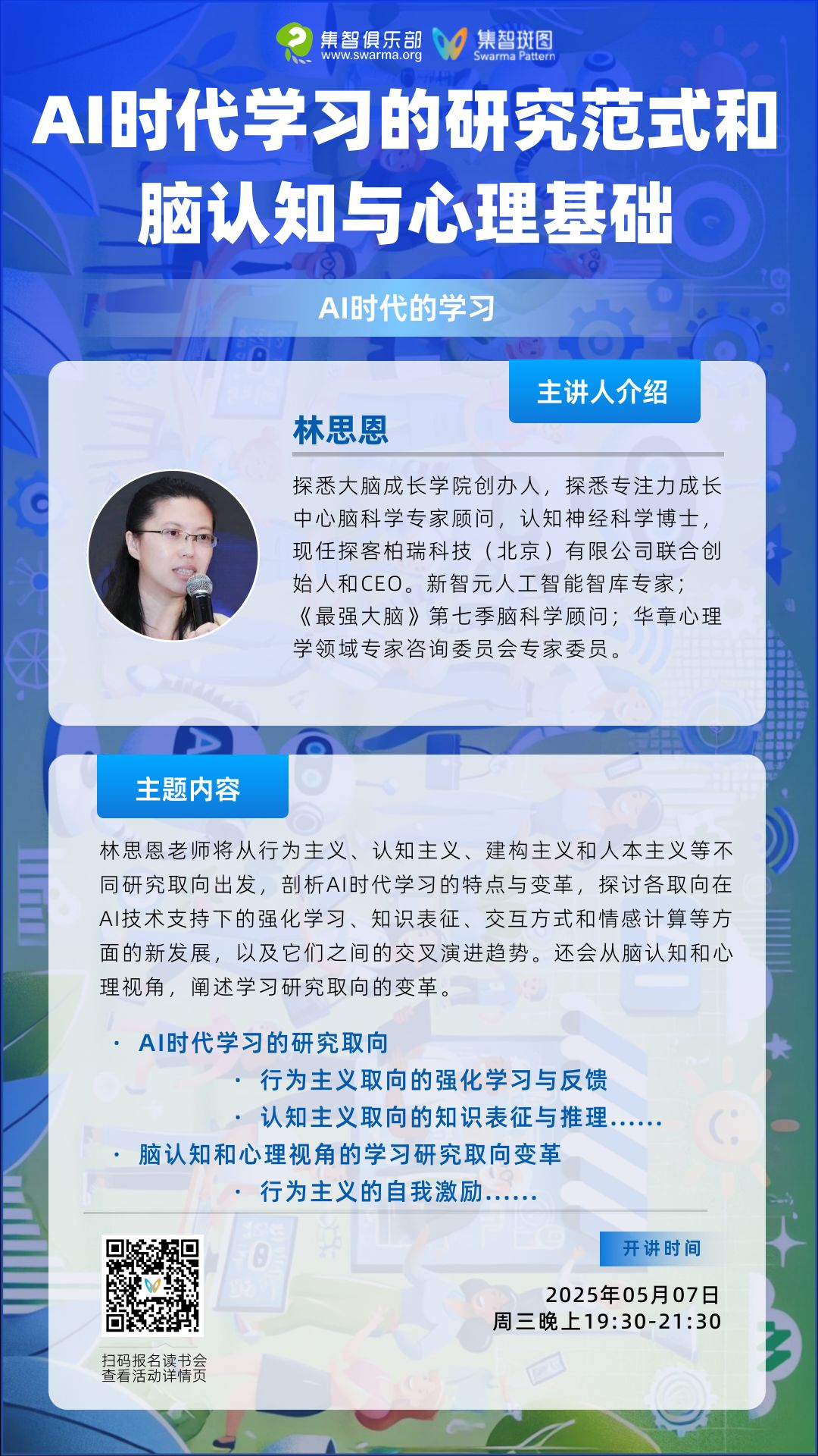 扫码参与「AI时代的学习:共探学习的复杂性」读书会,加入群聊,获取系列读书会回看权限,共建共享学习的复杂性社区,与一线科研工作者、教育实践者沟通交流,共同推动这一处于混沌状态的前沿领域的发展。
