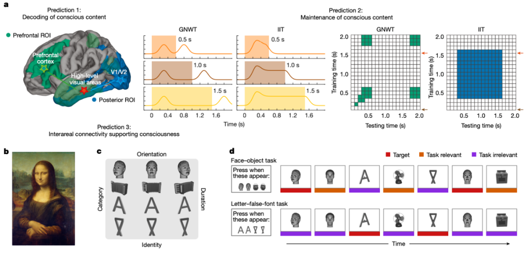 图1 | 预测与实验设计。a. 整合信息论(IIT)与全局神经工作空间理论(GNWT)的预测。对于预测1(意识内容的解码),IIT预测意识内容在大脑后部区域解码能力最强,而GNWT强调前额叶皮层(PFC)在其中的必要作用。对于预测2(意识内容的维持),IIT认为意识内容在后部皮质被主动维持,而GNWT预测刺激开始和结束时,PFC会有约0.3–0.5秒的短暂特定内容点燃,刺激间内容则以无意识的静默状态被储存。波形图(左)和时间泛化矩阵(右)说明了基于振幅和信息的时间特征:彩色矩形表示PFC(GNWT)和后部皮质(IIT;左)三个刺激持续时间;箭头标示刺激开始(棕色)和结束(红色),预测的时间泛化用绿色(GNWT)和蓝色(IIT)表示(右)。对于预测3(支持意识的脑区间连接),脑图上的星星和箭头表示预测的同步模式,绿色代表GNWT,蓝色代表IIT。脑表面图源自Freesurfer。b. 意识体验是多面的。例如,观看《蒙娜丽莎》时,人们不仅感知其处于特定空间位置,还将其归类为脸部、识别身份,并注意其朝向左侧,这种复杂体验会持续一段时间。c. 为了操控意识内容,刺激在四个维度上变化:类别(脸部、物体、字母和伪字体)、身份(各类别内的不同样本)、朝向(左、右、正面)和持续时间(0.5秒、1.0秒、1.5秒)。展示了刺激示例。d,实验范式。参与者在高对比度单个刺激序列中检测预定义目标(例如,特定的脸和物体,或字母和伪字体)。每个试次包含三种刺激类型:目标(红色,彩色框仅为示意)、与任务相关的刺激(橙红色,与目标类别相同)和与任务无关的刺激(紫色,其他类别)。刺激间的空白间隔未显示。面板c、d中的物体刺激图像由卡内基梅隆大学Michael J. Tarr提供,网址:http://www.tarrlab.org/;脸部刺激由FaceGen Modeler 3.1制作。