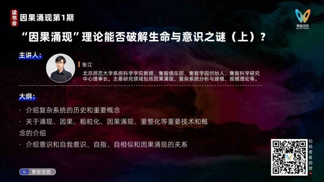 集智俱乐部因果涌现读书会由集智俱乐部创始人,北京师范大学教授张江发起,目前已经进行到第六季。他们研究团队提出的因果涌现的理论也逐渐丰富起来,试图用数据驱动的方式从信息论的角度理解生命、意识等复杂系统。这里推荐张江老师早期的一次讲座,如果你对这一话题感兴趣,欢迎扫码观看👇