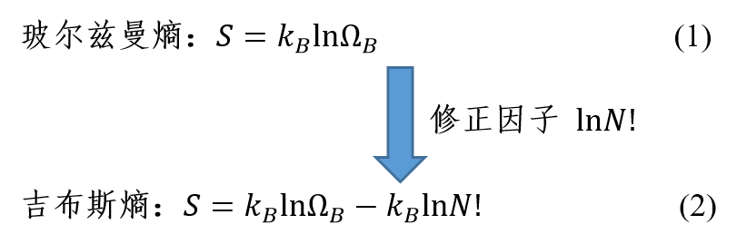 为了解决这一矛盾,吉布斯在玻尔兹曼熵表达式(1)中引入了修正因子 lnN!,从而修正了经典统计力学的计算结果,成功消除了这一佯谬[2]。