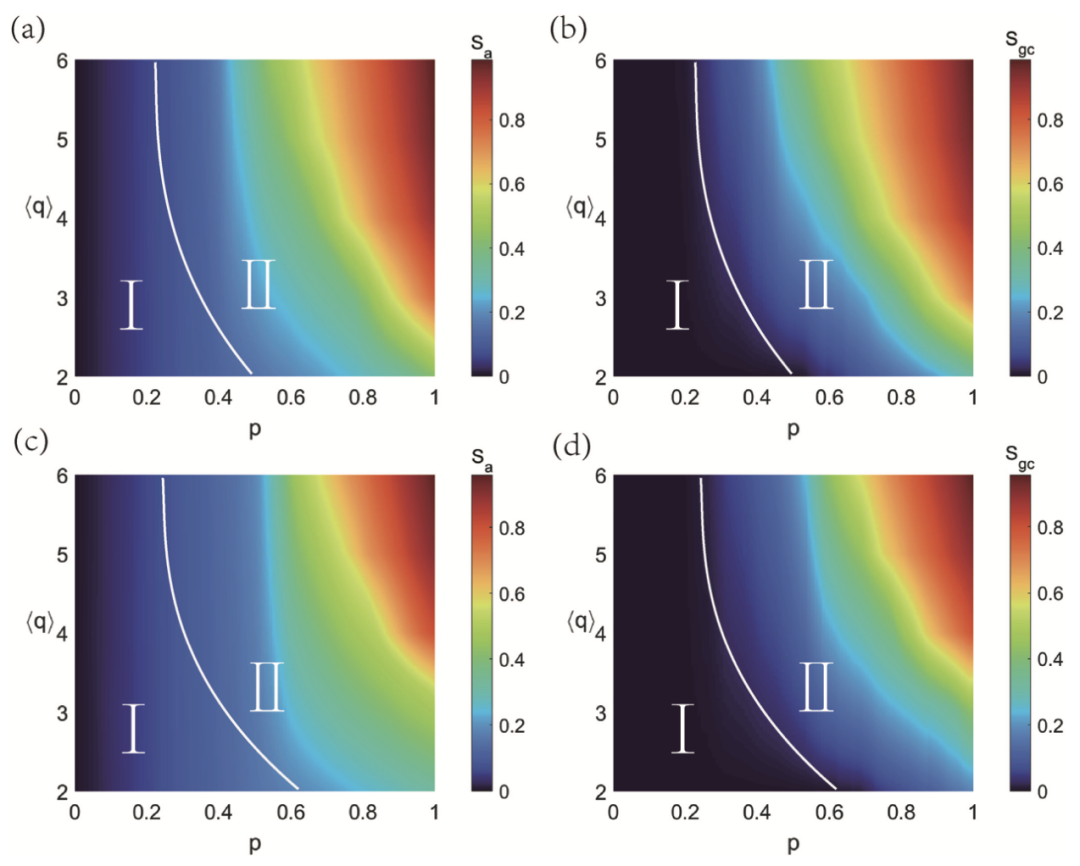 图 2. 在均匀超图中 d = 3 时的渗流转变。(a)和(c)活跃节点的比例 Sa 作为占据概率 p 和平均超度 ⟨q⟩ 的函数。(b)和(d)巨连通分量的大小 Sgc 作为占据概率 p 和平均超度 ⟨q⟩ 的函数。在(a)和(b)中阈值 K = 4,在(c)和(d)中阈值 K = 5。白色曲线表示渗流阈值。