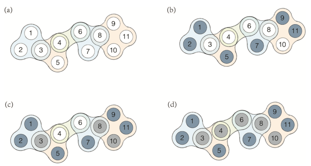 图 1. 在由 11 个节点和 5 条超边构成的随机超图中,阈值 K = 2 的自举渗流过程示意图,其中蓝色节点为初始激活节点,灰色节点为随后激活的节点。(a)初始状态下,超图中没有激活节点。(b)根据初始激活百分比 f 随机激活一些节点,即图中的蓝色节点。(c)由于图中两条超边中的激活节点数量达到阈值 K,因此整个超边被激活,超边中剩余的节点也被激活,即图中的灰色节点。(d)然后另外两条超边中的激活节点数量达到阈值,导致整个超边被激活,其剩余节点 4 和 6 也被激活。整个超图被激活,达到稳定状态。
