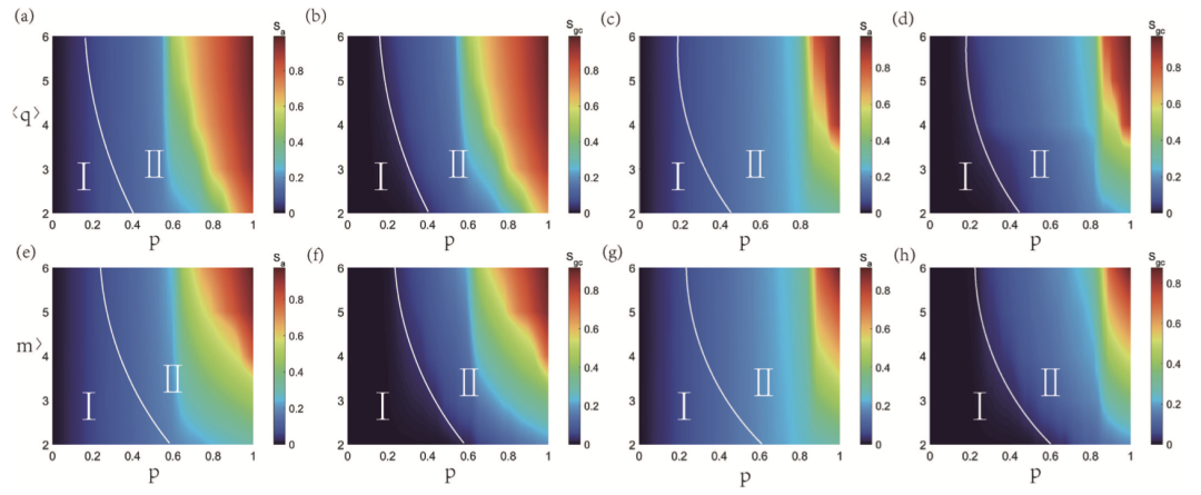 图 3. 随机超图上的渗流转变。(a)活跃节点的比例 Sa 作为占据概率 p 和平均超度 ⟨q⟩ 的函数,K = 4。(b)GAC 的大小 Sgc 作为占据概率 p 和平均基数 ⟨q⟩ 的函数,K = 4。(c)活跃节点的比例 Sa 作为占据概率 p 和平均超度 ⟨q⟩ 的函数,K = 5。(d)GAC 的大小 Sgc 作为占据概率 p 和平均基数 ⟨q⟩ 的函数,K = 5。(e)-(h)在相同参数设置下平均基数和占据概率对渗流的影响。白色曲线代表渗流阈值。