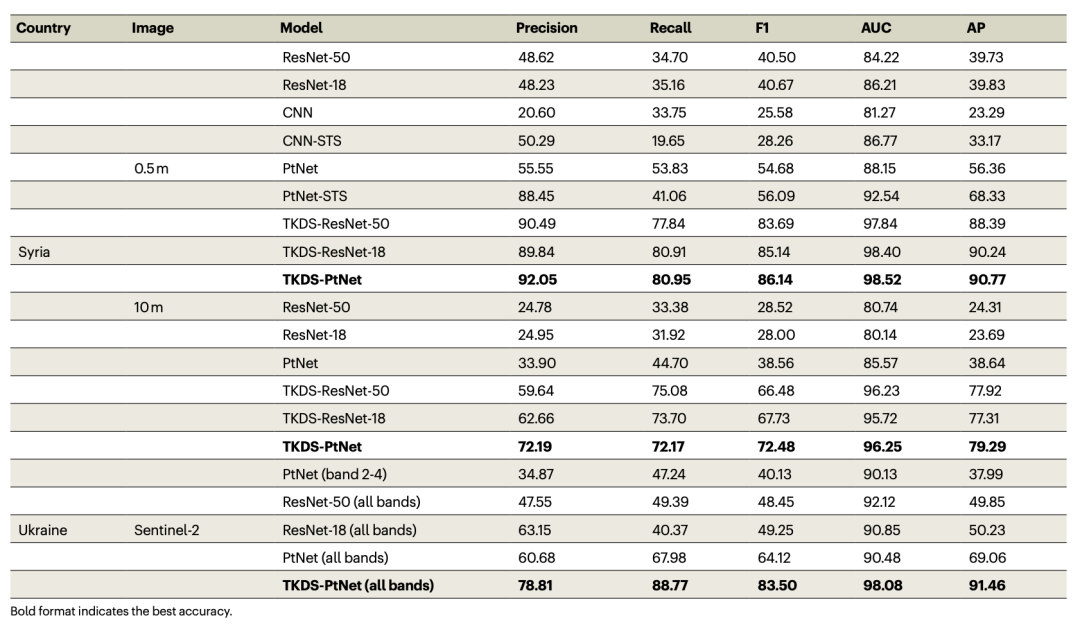 TKDS-PtNet在叙利亚6个城市和乌克兰4个城市的测试中表现卓越:使用0.5米分辨率图像时,F1分数达86.1;即使采用10米分辨率图像,F1分数仍达72.5,较传统卷积神经网络(CNN)提升44%以上。