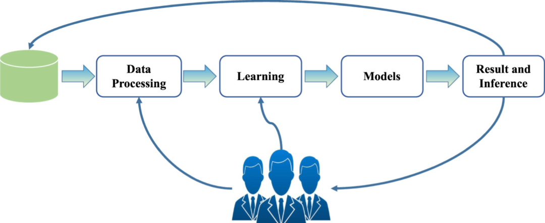 多位研究者尝试从数据角度出发,采用“人在环路”(Human-in-the-Loop)的方法优化模型。据调查,相较于模型构建,科学家约80%的时间花费在数据处理上 [30]。我们对基于“人在环路”的数据处理方法进行了调研,并建立了如图3所示的处理流程。同时,我们回顾了该领域具有代表性的研究工作,并将其分类结果汇总于表1中。本节将从数据预处理、数据标注与迭代标注三个方面,深入探讨“人在环路”方法在数据处理中的优势与不足。