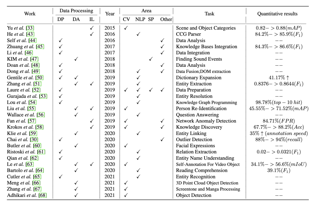表 1. 数据处理领域代表性工作的概述。DP: 数据预处理;DA: 数据标注;IL: 迭代标注;CV: 计算机视觉;NLP: 自然语言处理;SP: 语音处理。