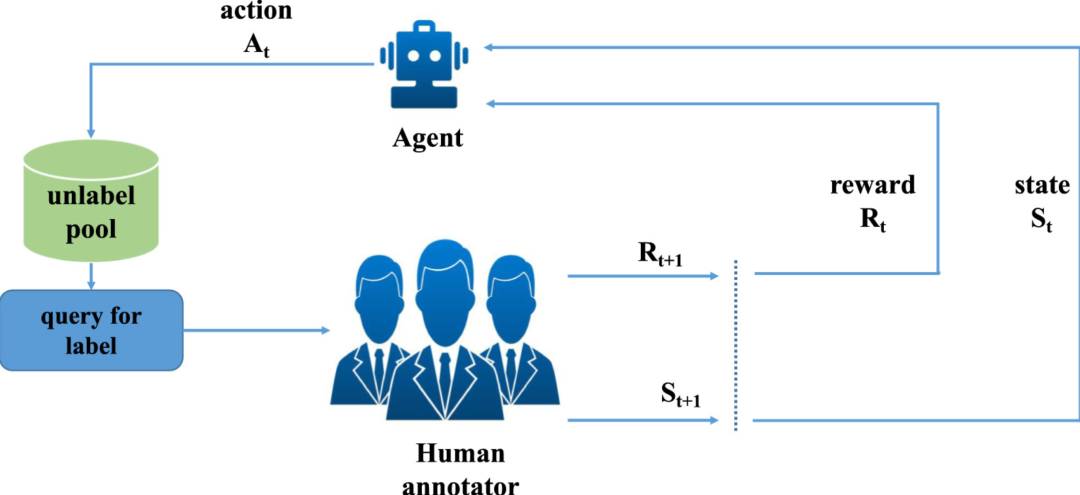 Yu 等人[33]利用了一种部分自动化的标注方案,通过结合人机交互的深度学习技术,减少了人工劳动量,这构成了简单迭代标注的基本原型。近年来,随着强化学习的广泛应用,Liu 等人[55]开发了一种基于强化学习的“人在环路”系统,将强化学习应用于迭代标注。图5展示了基于强化学习的“人在环路”典型框架。这一创新尝试首次将人机交互方法推广到强化学习领域,为人机交互社区带来了宝贵贡献。除了实现简单的人工干预外,他们以行人再识别为研究任务,探索如何在最大限度减少人工标注工作的同时优化再识别性能。Fan 等人[57]则致力于解决网络异常检测中的数据挑战,允许用户参与数据标注而非单纯进行标注操作。他们引入了一种结合主动学习与视觉交互的智能标注方法,通过用户的迭代标注过程检测网络异常。其不同之处在于,开始关注算法与视觉界面的结合,实现算法与视觉界面的紧密融合。
