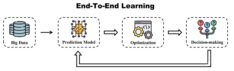 端到端学习方法(End to End Learning,E2E):也称为决策驱动学习。该方法将优化结构嵌入训练过程中,通过决策反馈直接调整预测模型,实现从预测到决策的闭环学习,从而更好地对齐预测与决策目标,有助于减少序贯优化方法中存在的偏差问题。具体来说,该方法将最优决策目标