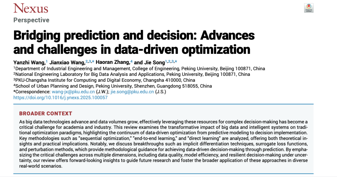 在当今大数据时代,数据已成为推动决策的核心资源。然而,如何将海量数据转化为最优决策,仍是学术界和工业界面临的重大挑战。近日北京大学宋洁教授团队在Cell Press交叉学科期刊Nexus发表题为《Bridging Prediction and Decision: Advances and Challenges in Data-Driven Optimization》的观点性综述文章,系统探讨了数据驱动的方法在预测和决策领域的应用。文章系统总结了序贯优化(SO)、端到端学习(E2E)和直接学习(DL)三种数据驱动型优化方法的理论、优势和最新进展,并结合能源调度、运筹管理和智能控制等典型应用场景进行了分析,通过剖析数据质量、优化建模和决策应用等关键问题,文章提出了对应的解决方案,为面向复杂环境的智能决策提供了重要的理论支撑和方法指引。