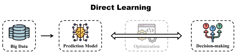 直接学习方法(Direct Learning,DL)则另辟蹊径,不去求解优化问题(公式 6-7),转而寻找输入变量x与决策变量z的直接关系,该方法主要适用于那些优化问题结构复杂或隐式表达的场景,在难以明确定义优化过程时表现出卓越的适应性和灵活性。例如,在强化学习(Reinforcement Learning,RL)框架下,主要目标是求解马尔可夫决策过程(Markov Decision Process,MDP)的奖励值最大化,