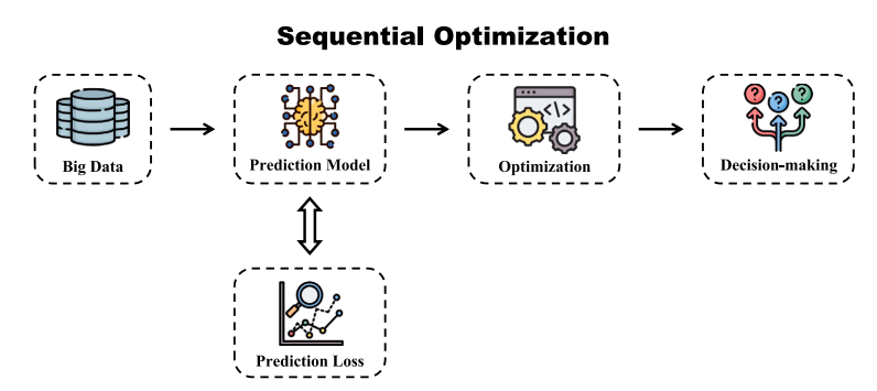序贯优化方法(Sequential Optimization,SO):该方法采用“预测”-“优化”两阶段流程来解决决策问题:首先利用预测模型对不确定因素进行估计,再将预测结果输入优化模块生成决策。此方法直观且模块化,各环节可独立优化,实现人工智能与决策模型的直接耦合。常用的实现为第一步是通过数据驱动的方法,发现数据所代表的复杂系统的潜在运行模式,从而得到预测值