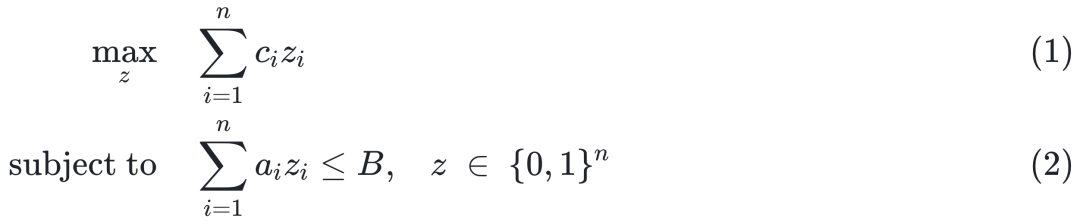 装载问题(个人决策):假设有一辆载重量上限为B的货车来到货场,需要从n件货品中选择部分货物进行装载。每件货物i的重量为ai,价值为ci。车主的目标是在不超过货车最大载重量B的前提下,选择若干件货物,使得被选中的货物的总价值最大。