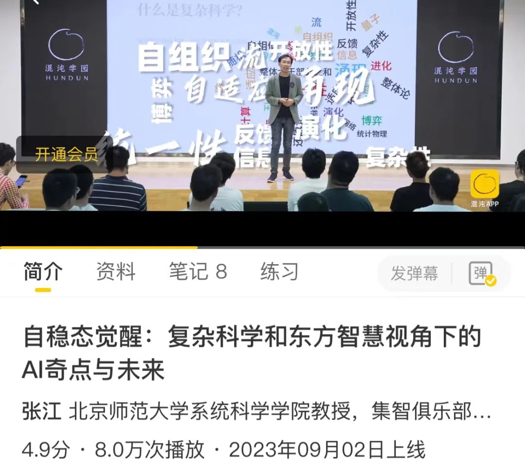 2023年,张江老师首次将复杂性阶梯理论与东方智慧融合,在混沌学园讲授新课:《自稳态觉醒:复杂科学和东方智慧视角下的AI奇点与未来》,此课程刚一上线,就引爆混沌学园APP平台。