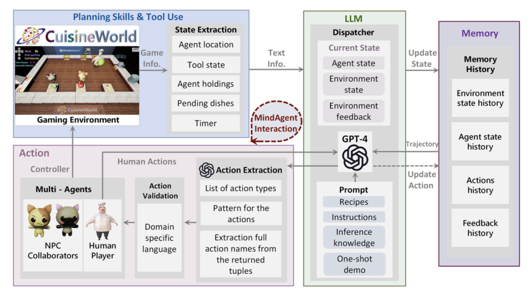 在游戏领域,Agent AI正重塑非玩家角色(NPC)的行为逻辑。传统脚本驱动的NPC行为呆板,而基于LLM的智能体(如《外交》游戏中的AI)已能通过人类对话数据训练实现战略决策。研究团队开发的“MindAgent”框架在《CuisineWorld》多智能体协作游戏中,通过GPT-4中央调度器协调多个智能体完成烹饪任务,其协作效率评分(CoS)验证了语言模型在复杂策略规划中的潜力。
