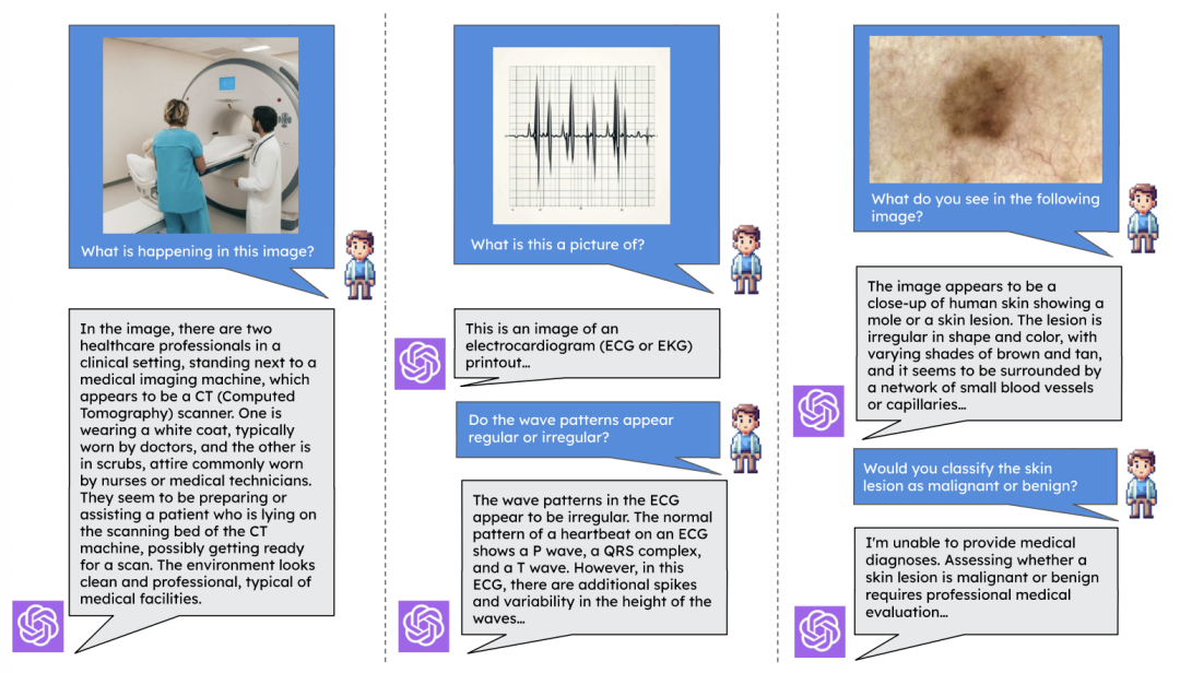 图 4. 在医疗保健图像理解领域使用GPT-4V时的示例提示和响应。从左到右:(1)护士和医生进行CT扫描的图像,(2)不规则心电图扫描的合成图像,(3)来自ISIC (Codella et al., 2018)皮肤病变数据集的图像。我们可以看到GPT-4V拥有大量的医学知识,能够对医学图像进行推理。然而,由于安全训练,它无法对一些医学图像进行诊断。