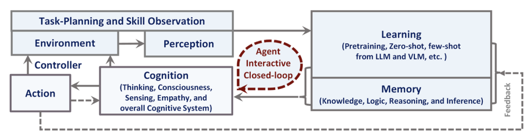如下图所示,这种新型架构包含五大模块:环境感知与任务规划、智能体学习、记忆系统、行动预测和认知推理,其创新之处在于引入专属的“智能体令牌”(Agent Tokens)来表征特定领域的动作空间,相比传统冻结参数的多模态模型(如Flamingo、BLIP-2),这种端到端训练范式在机器人控制等任务中展现出更强的适应性。