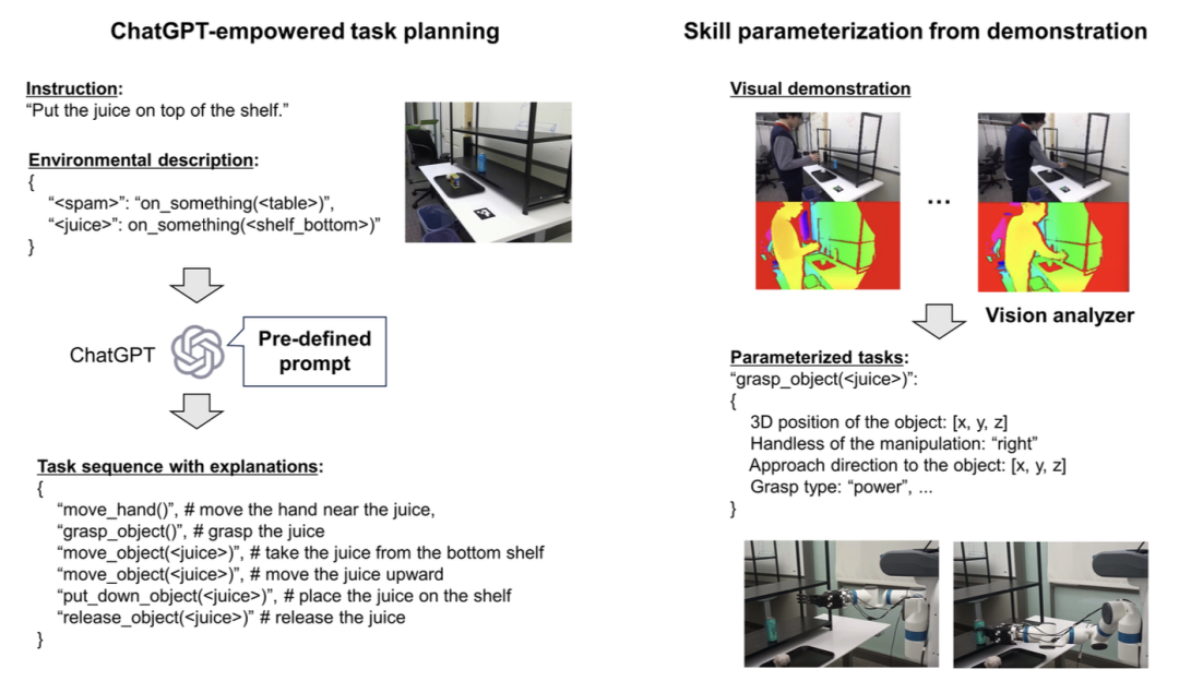 图 3. 集成 ChatGPT 强化任务规划器的机器人教学系统概述。该过程包含两个步骤:任务规划,用户使用任务规划器创建动作序列,并根据需要通过反馈调整结果;演示,用户通过视觉展示动作序列,为机器人操作提供所需信息。视觉系统收集用于机器人执行的视觉参数。