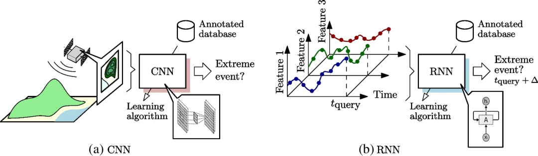 图4. 深度学习模型用于极端天气事件预测的典型案例:(a) CNN, (b) RNN。(Salcedo-Sanz et al., 2024)