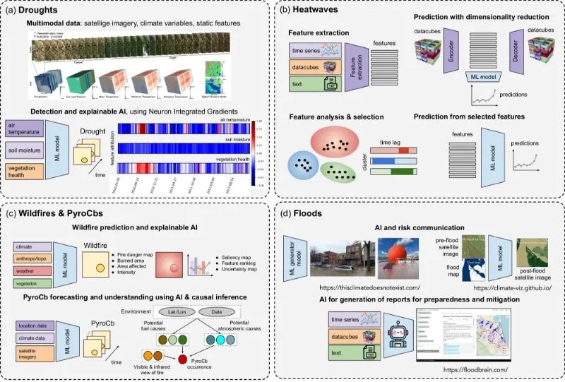 图3. 使用AI进行极端天气事件研究的案例(干旱、热浪、野火和洪水)。(Camps-Valls et al., 2025)