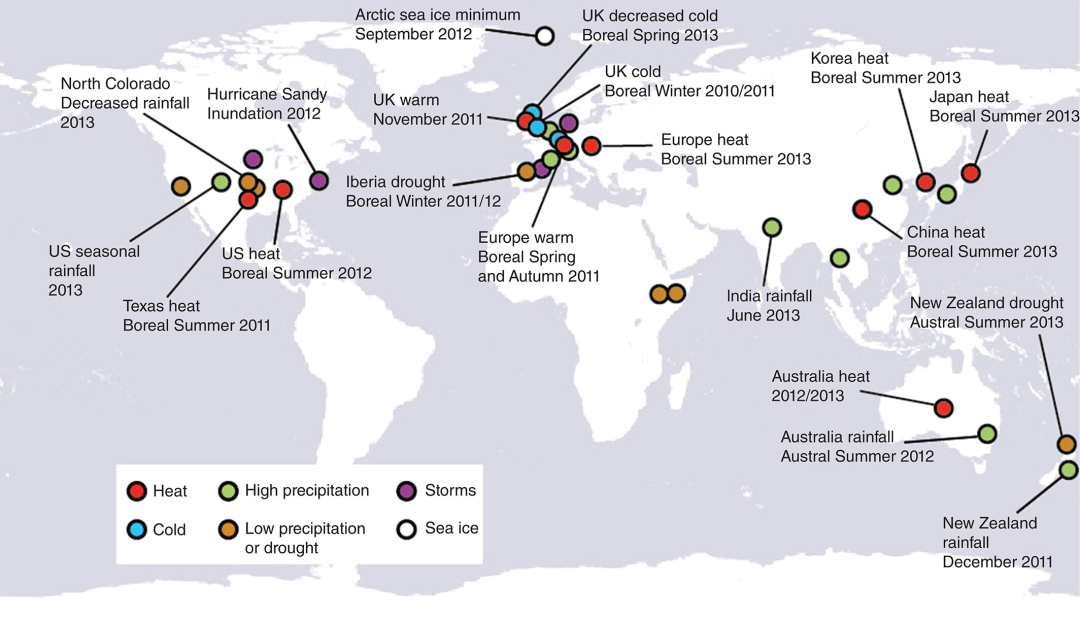 图2. 2011-2013年美国气象学会公报中考虑的极端天气事件。(Stott et al., 2016)