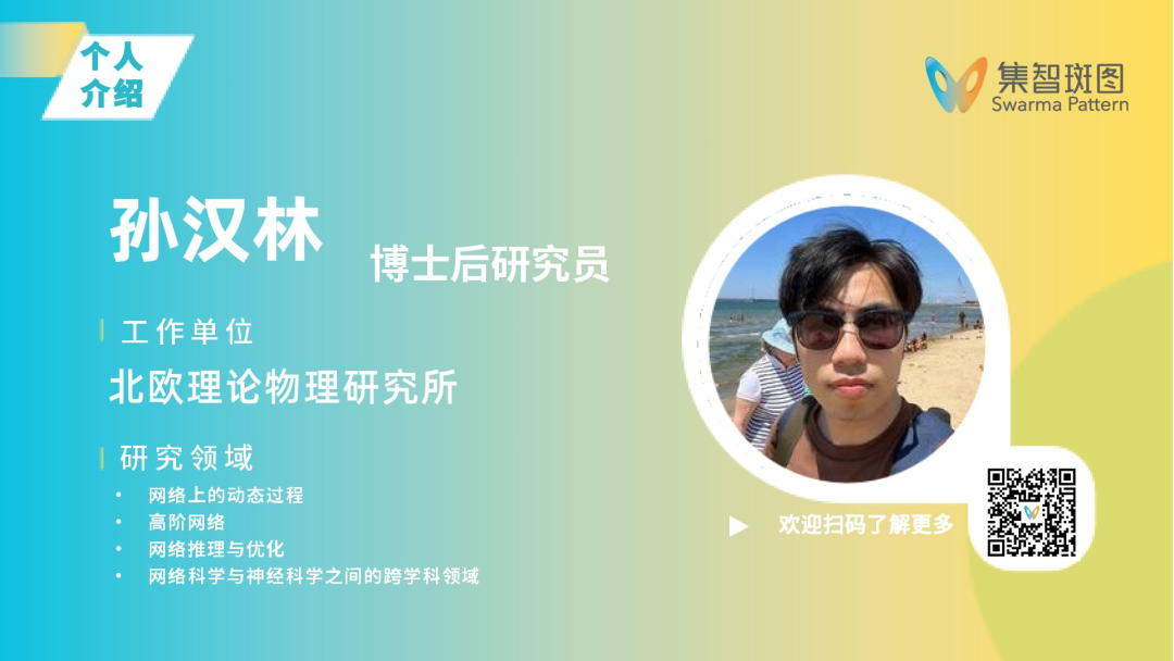 孙汉林,北欧理论物理研究所(NORDITA)的博士后研究员,格拉纳达大学(University of Granada) 玛丽居里学者。研究兴趣包括网络上的动态过程、高阶网络、网络推理与优化,以及网络科学与神经科学之间的跨学科领域。 在伦敦玛丽女王大学攻读博士学位期间,专注于网络理论的研究。研究重点是网络及其他具有高阶交互作用结构(如单纯复形和超图)上的动态过程的多个方面,指导教师为Ginestra Bianconi教授。 在Nature Physics, Science Advances, Physical Review X, Physical Review Letter等期刊共发表论文14篇。 研究兴趣包括渗流理论、消息传递算法、超图和单纯复形、疫情传播、统计物理、网络上的推理与优化、多层网络以及量子网络。