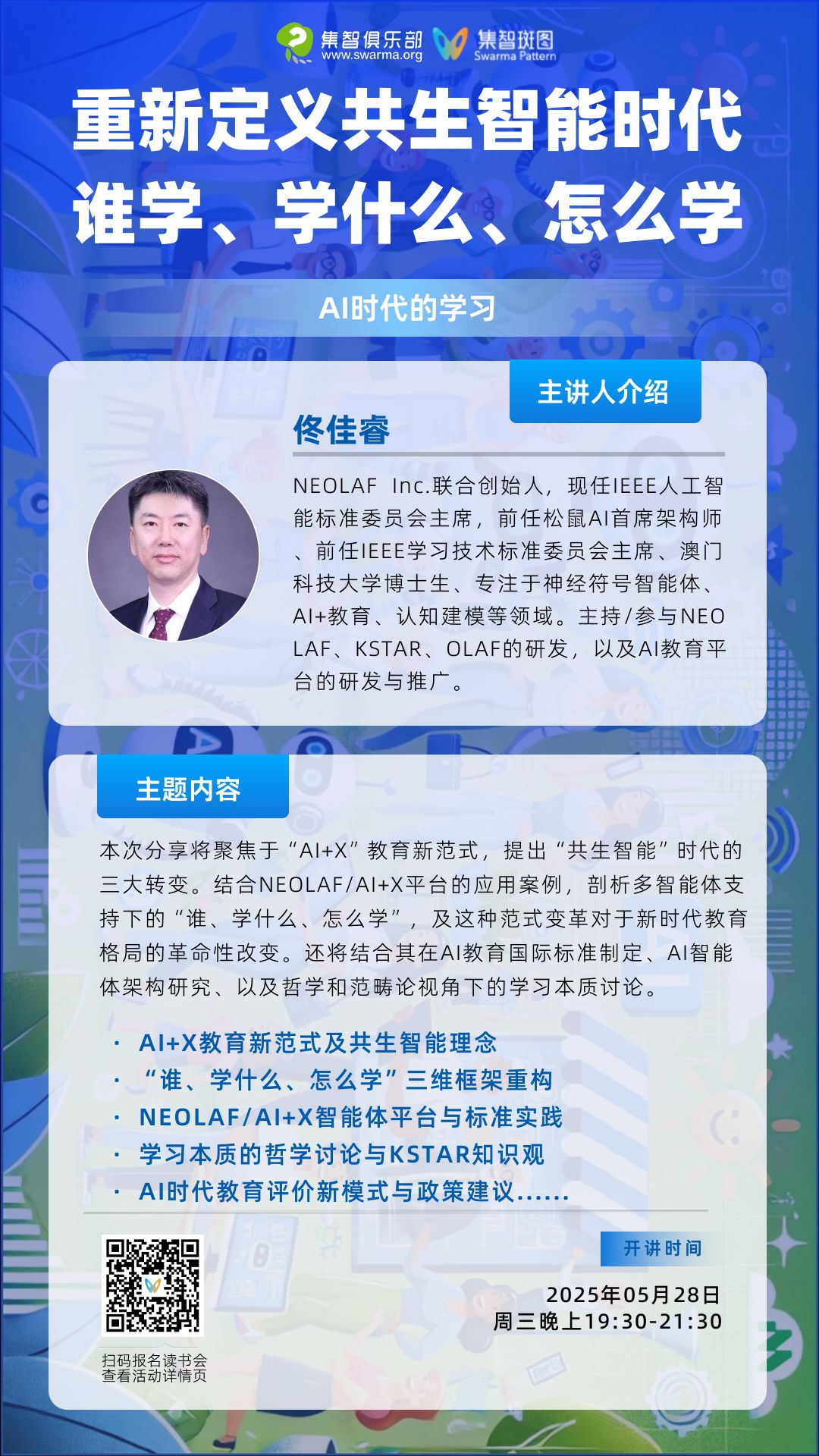 佟佳睿(Richard Jiarui Tong)将结合NEOLAF/AI+X平台在国内外的应用案例,剖析多智能体支持下的“谁、学什么、怎么学”,以及这种范式变革对于新时代教育格局的革命性改变。还将结合其在AI教育国际标准制定、AI智能体架构研究、以及哲学和范畴论视角下的学习本质讨论,全面展现未来教育的发展方向。