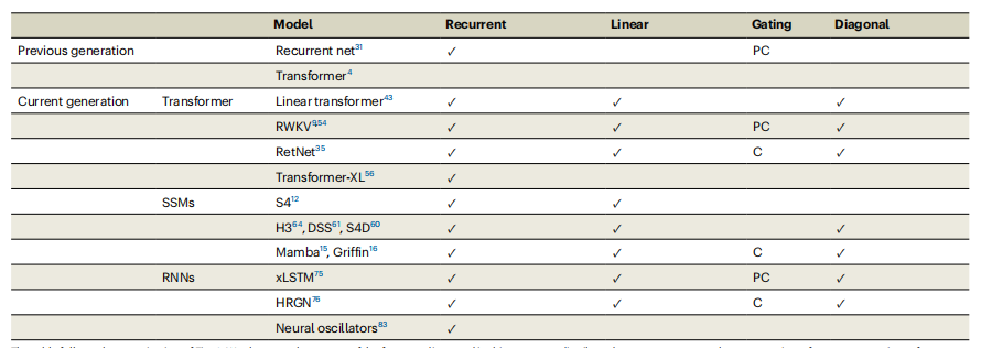 表1 :用于长序列处理的前一代与当前一代架构对比(遵循图1的组织方式,展示了本文讨论的一些特征在近期不同方法中的分布情况,比较了几类代表性模型)