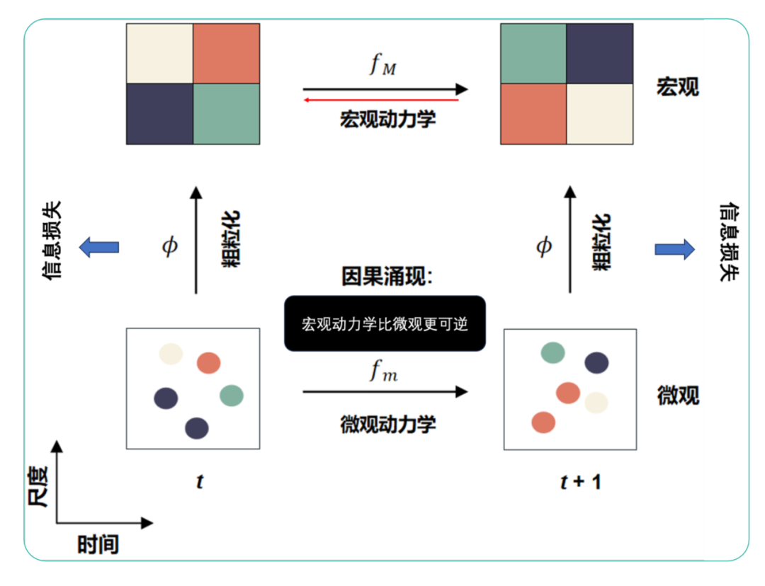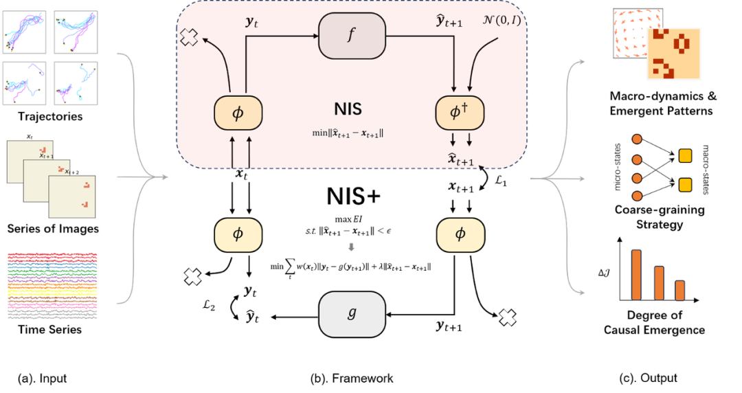 那么对于机器观察者,我们如何保证,机器不是去计算每一个分子运动的微分方程,而是像人一样尽可能去寻找 PV=nRT 这样简洁的视角呢?机器如何寻找到最佳观测尺度,识别出涌现的发生呢?关键在于前面所说的,要最大化宏观动力学的有效信息。我们在初始机器学习框架的基础上,在宏观尺度上添加一个反向动力学的预测,不仅要让它从过去预测未来能预测准,同时从未来的状态反过来猜测过去的状态时,也能溯因比较准,以此来保证宏观动力学这个狭窄的信息瓶颈中,流通的都是有效信息。这个改进的框架我们称之为扩展版本的神经信息压缩器(NIS+),它可以通过训练得到有效信息最大的宏观动力学,从而客观地识别出涌现。