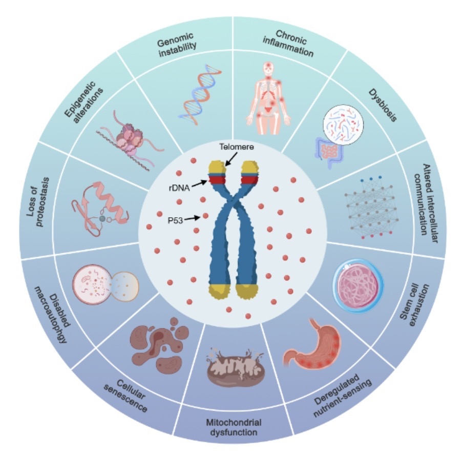 关键词:衰老标志(Aging Hallmarks)、因果关系(Causality)、端粒(Telomere)、核糖体DNA(rDNA)、P53通路、程序化衰老