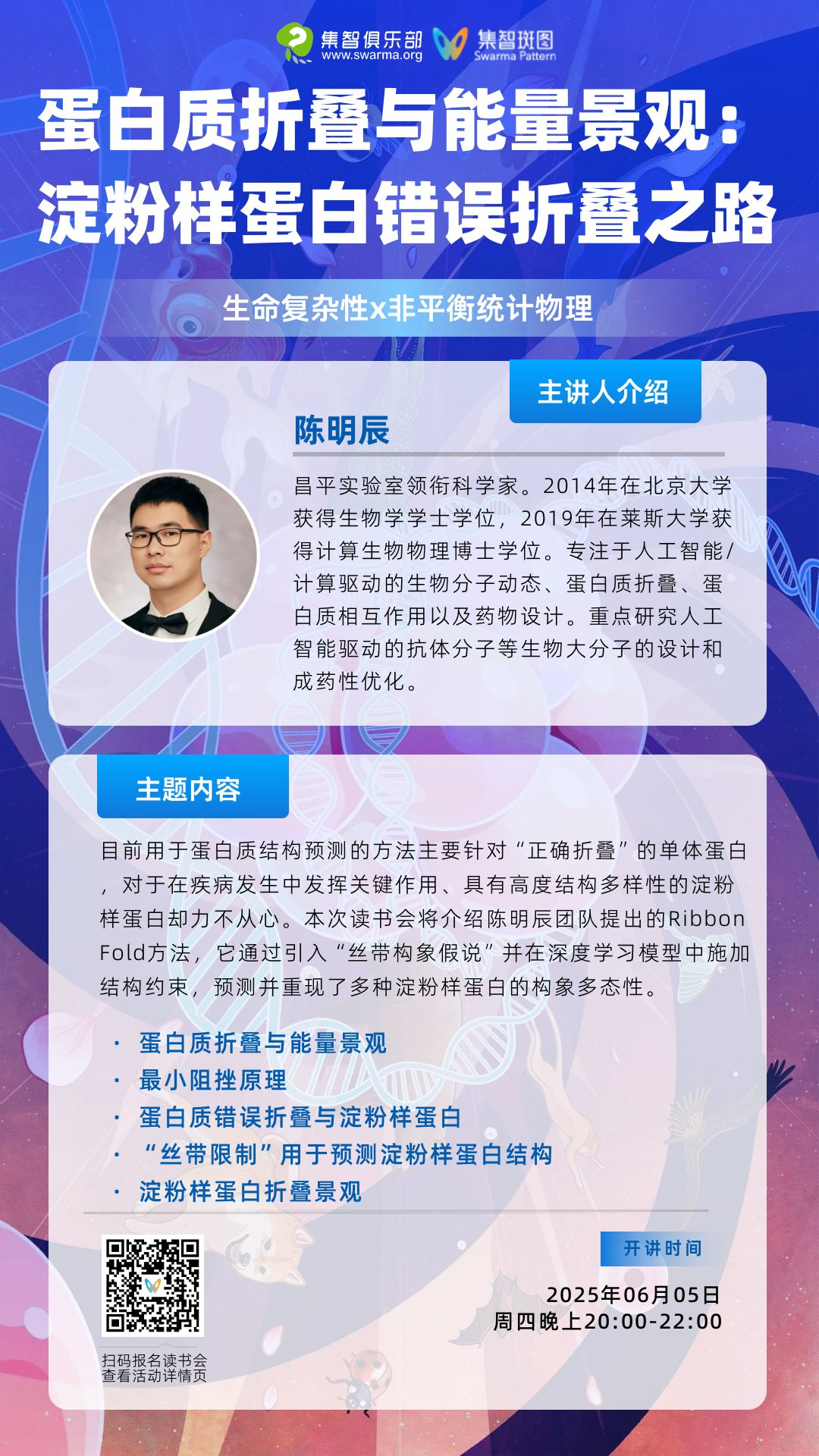 近日,昌平实验室陈明辰团队在PNAS上发表最新研究论文,提出全新的 RibbonFold 方法,通过引入“丝带构象假说”并在深度学习模型中施加结构约束,首次系统性预测并重现了多种淀粉样蛋白的构象多态性,为理解神经退行性疾病等相关病症的分子机制提供了新的窗口。本次读书会将首先介绍蛋白质折叠与能量景观等基础概念,进一步讨论蛋白质错误折叠与淀粉样蛋白,之后介绍“丝带限制”用于预测淀粉样蛋白结构的最新进展,希望与大家一起探讨人工智能、统计物理、蛋白质折叠这一前沿交叉领域。