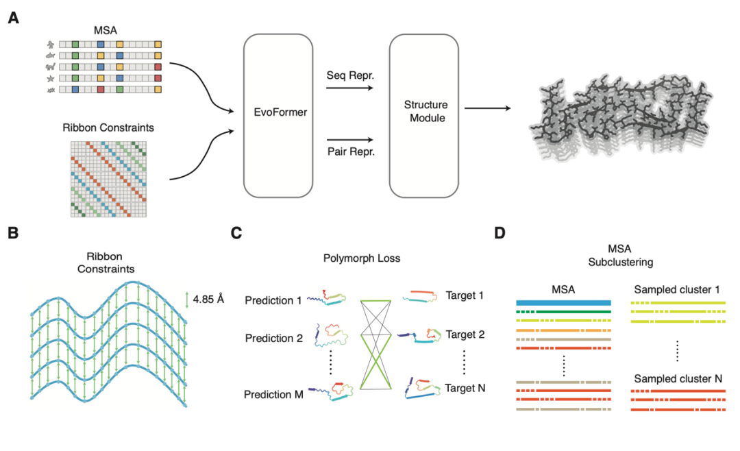 面对这些挑战,团队开发了RibbonFold方法,它不仅继承了AlphaFold2在序列到结构预测方面的强大能力,更通过“结构约束注入”策略专为预测淀粉样蛋白结构而设计。
