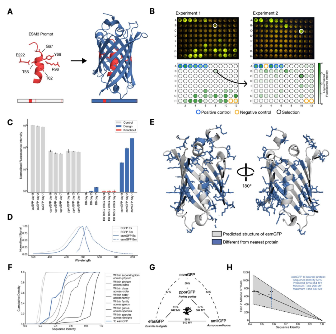 图 2. 通过一系列的思考生成一种远距离荧光蛋白。(A)我们用形成和催化发色团反应所需的残基序列和结构以及天然绿色荧光蛋白(GFP)部分中央α螺旋的结构来提示 ESM3(左)。通过一系列的思考,ESM3 生成设计候选(右)。(B)在两次实验中,ESM3 找到了一种远离其他已知 GFP 的明亮 GFP。我们在大肠杆菌裂解液中测量了荧光。上排,平板照片。下排,平板读取器荧光定量。已知 GFP 的阳性对照用紫色圆圈标记,没有 GFP 序列或没有大肠杆菌的阴性对照用红色圆圈标记。在第一次实验(左)中,我们表达了具有不同序列同源性的设计。在 B8 孔(底部黑色圆圈,顶部白色圆圈突出显示)中出现了一个值得注意的设计,其与已知荧光蛋白的序列同源性较低(57%)。我们从 B8 孔中的蛋白质继续进行第二次实验(右)。在 C10 孔(与已知荧光蛋白的序列同源性为 58%,黑色圆圈)中出现了一个明亮的设计。(B)我们将其命名为 esmGFP 的是底部为白色圆圈顶部为绿色荧光蛋白的结构。(C)esmGFP 的荧光强度与常见的 GFP 相似。实验 2 中部分蛋白质的归一化荧光强度如图所示。(D)esmGFP 的激发和发射光谱与 EGFP 的光谱重叠。(E)esmGFP 预测结构中中央α螺旋和β桶内部的两个截面图。esmGFP 相对于其最近的邻居 tagRFP 的 96 个突变以蓝色显示。(F)不同分类群中荧光蛋白之间的序列同源性累积密度。esmGFP 与其他所有 FP 的相似程度通常在比较不同目但同属的序列时才会出现。(G)三种典型珊瑚纲 GFP 和 esmGFP 的进化距离(以百万年为单位)和序列同源性。(H)根据 GFP 序列同源性估算的进化距离(以百万年为单位)。我们估计 esmGFP 与已知最近的蛋白质在自然进化中相隔超过 5 亿年。