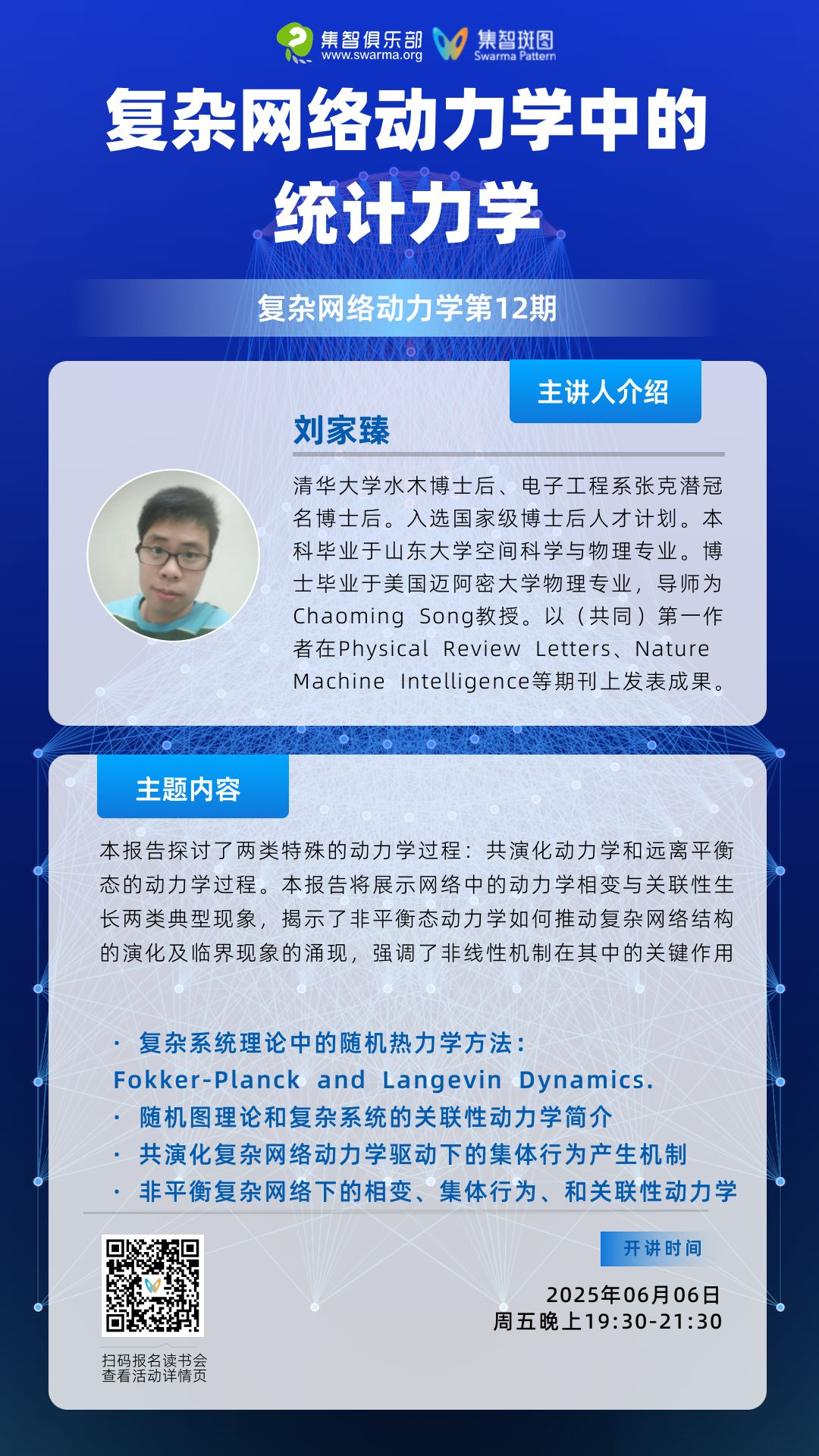 扫码参与「复杂系统网络动力学」读书会,加入群聊,获取系列读书会回看权限,加入网络科学社区,与社区的一线科研工作者沟通交流,共同探索复杂网络动力学这一前沿领域的发展。