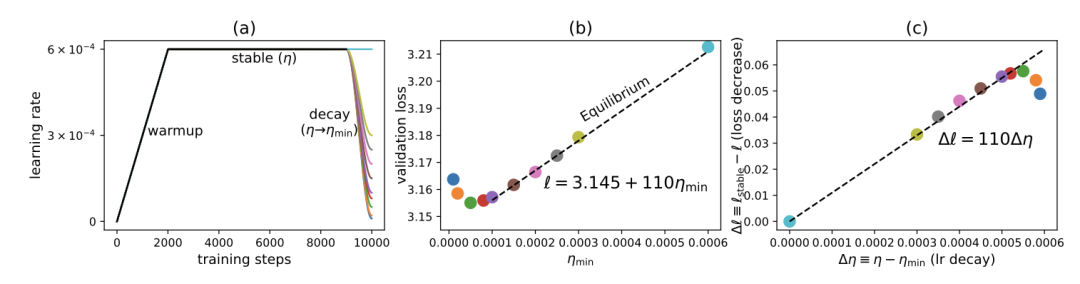 为最终学习率。(b)当较大时,验证损失是的线性函数。(c)很小时,是的线性函数。