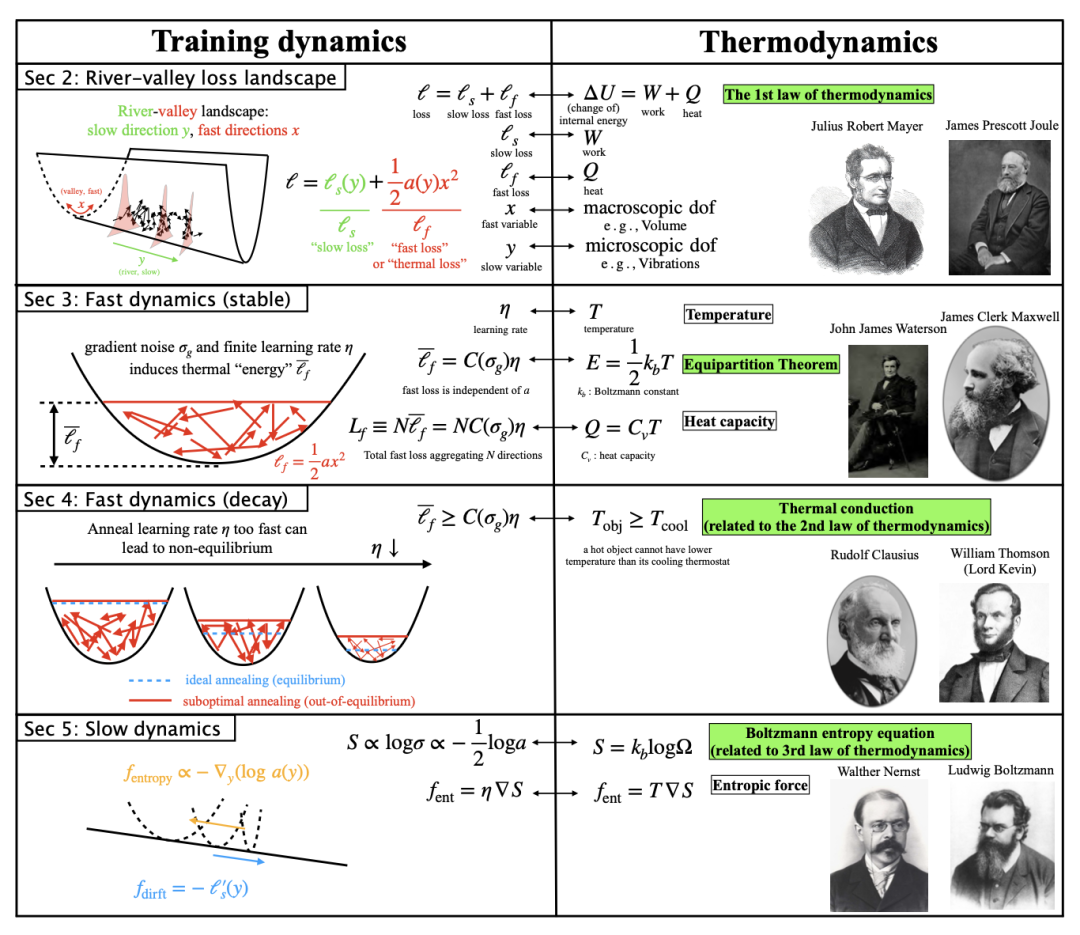 近年来,大语言模型的训练动态与热力学系统间的相似性引发关注:两者均涉及海量自由度与随机性。然而,LLM的损失函数景观(loss landscape)因其“河流-山谷结构”(river-valley structure)的复杂性——平坦缓慢变化的河流方向(slow direction)与陡峭快速变化的山谷方向(fast direction)共存——成为理解训练动力学的难点。Max Tegmark团队最新提出了神经热力学定律(Neural Thermodynamic Laws, NTL),首次将热力学核心概念(如温度、熵、热传导)与LLM训练动态建立严格对应,并推导出可验证的学习率调配优化准则。