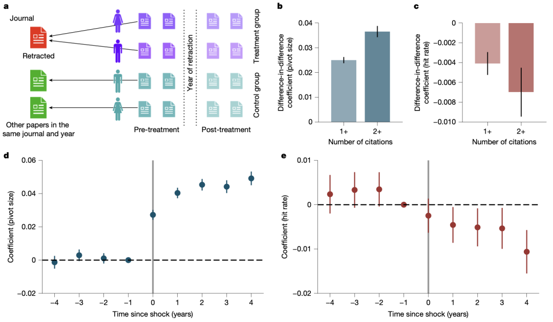 图 3. 枢轴和撤稿事件。a,这种差异中差异分析(difference-in-differences analysis)比较了直接引用被撤稿前的论文的科学家和引用与被撤稿论文相同期刊和年份的其他论文但不引用被撤稿论文的对照科学家。在撤回论文之前,有164988名被处理的作者至少引用过一次(18505名被处理的作者至少引用过两次),但他们本身并不是被撤回论文的作者。将这些被处理科学家的论文的枢轴大小和影响与相同数量的对照科学家在撤稿前后的论文进行比较。b,牵回后,实验组科学家的枢轴大小明显高于对照组科学家(0.025±0.001 s.e)。pivot-size增加,P < 0.0001,回归,n = 582万作者的论文观察值)。当关注引用撤回论文至少两次的科学家时,效果更大(0.037±0.001 s.e.)。pivot-size增加,P < 0.0001,回归,n = 296万作者论文观察值)。c,撤稿后被治疗的科学家的论文点击率下降(- 0.004±0.001,P < 0.0001, n = 582万),并且引用撤稿论文两次以上的科学家的影响更强(- 0.007±0.001,P < 0.0001, n = 296万)。d,e,对治疗组和对照组作者的逐年分析进一步表明,从撤稿年份(d)开始,枢轴大小的增加具有统计学意义(P < 0.001),从撤稿后一年(e)开始,命中率的下降具有统计学意义(P < 0.05)。在b-e中,条形和标记表示差中差回归系数,晶须表示由回归标准误差得出的95%置信区间(见差中差)。