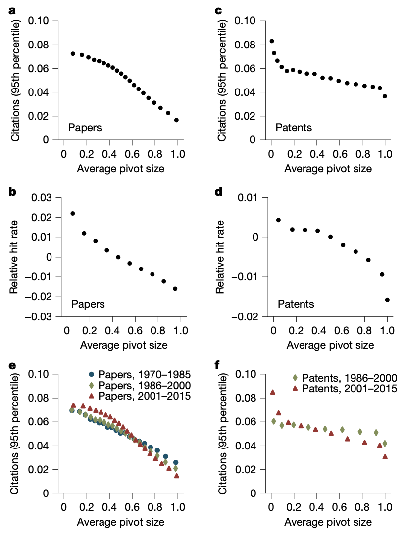 图 2. 枢轴惩罚。a,在一项对1970年至2015年发表的2580万篇论文的研究中,枢轴越大的论文具有高影响力的概率就越低。b,对于一个特定的作者,其论文的相对影响力随着枢轴大小而急剧下降。c,在一项对1980年至2015年的172万件美国专利授权的研究中,枢轴规模越大的专利具有高影响力的概率就越低。d,对于一个特定的发明者,其专利的相对影响随着枢轴的大小而下降。随着时间的推移,枢轴小与高影响力作品之间的关系在科学出版(e)和专利(f)中变得越来越负相关。