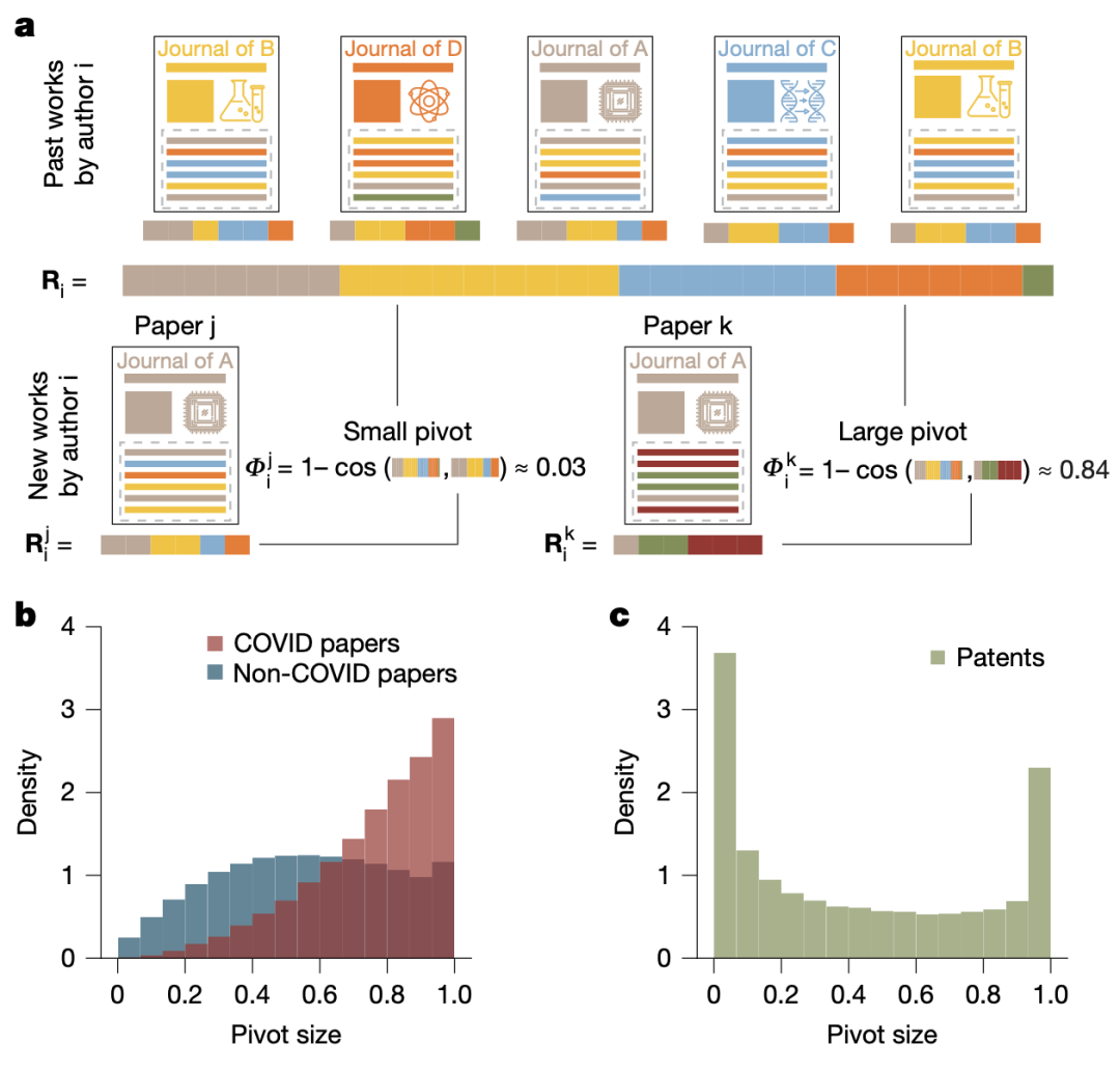 图 1. 量化研究枢轴。a、枢轴度量将焦点工作与同一研究人员以前的工作进行比较。区间[0,1]上的值越大,表明研究人员先前工作的枢轴越大。在科学领域,期刊被用来定义研究领域(如图);在申请专利时,使用技术分类。b,作者枢轴在2020年的分布(n = 832万篇论文作者观测值)分散在[0,1]区间内。c, 2020年发明人枢轴的分布(n = 166,000个按专利发明人观察值)分散在[0,1]区间内,并且是双峰分布。2020年,COVID-19论文(b)的中位数枢轴值高于其他论文。