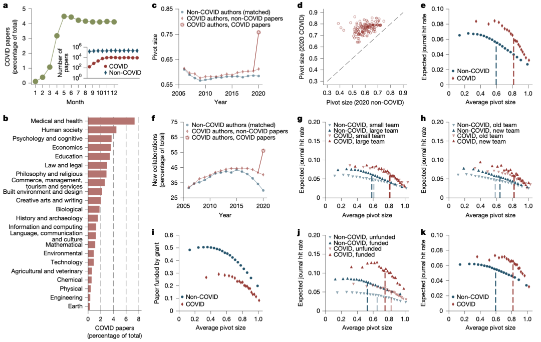 图 4. 枢轴与COVID-19疫情。a,学界在2020年迅速转向COVID-19 (COVID -19)研究,2020年5月,COVID-19出版物占所有科学出版物的4.5%,此后一直保持高比例。b .卫生科学和社会科学的反应最为强烈,但所有从事COVID-19研究的科学领域都是如此。c,撰写COVID-19论文的科学家比他们在之前的工作中、在2020年的其他工作中或比匹配的对照科学家转向的程度更大。d、比较2020年各领域的COVID-19和非COVID-19论文,异常大的枢轴是COVID-19研究的普遍特征。e, COVID-19论文经历了影响溢价,但在COVID-19和非COVID-19研究中都出现了枢轴惩罚。与中值枢轴规模(虚线)相比,由于中值枢轴规模较大,COVID-19的影响溢价基本上被枢轴惩罚抵消。f,g,h,对于COVID-19研究人员来说,与新合作者合作尤其常见,与他们自己以前的工作、2020年的其他出版物以及对照科学家相比,他们与新合作者的合作程度不同寻常(f)。尽管如此,对于大型和小型团队(g)以及聘用新的或现有的共同作者(h)来说,枢轴惩罚仍然存在。i,j,枢轴较高的工作在整个科学领域(蓝色)和COVID-19论文(红色)中承认资金支持的可能性要小得多。COVID-19论文尤其不可能承认资助支持(i),但枢轴惩罚甚至出现在资助工作和非资助工作中(j)。k,尽管个人、合作和资助特征严重制约了科学的适应性反应,但在回归分析中,它们并没有单独或集体克服基本的枢轴惩罚。