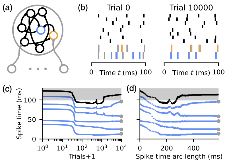 图 3. 在RNN中学习精确的尖峰。(a)网络示意图。神经元在每次试验中都接收到来自外部输入神经元的相同尖峰信号。学习了前两个网络神经元的峰值时间。(b)学习前后网络神经元的尖峰。(c)学习过程中第一个神经元的峰值时间轨迹。期望的峰值向目标时间移动。(d)与(c)相同,但尖峰时间显示为输出尖峰时间轨迹弧长的函数。